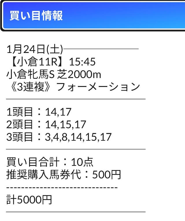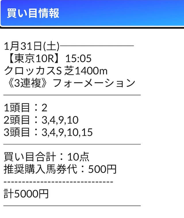 3.0名無しさん20代 男性 職業:◎良い点コスパ◯今まで予想を見たレースは3連複の10点だった。推奨されてされているのは1点500円だけど、これ1点100円にしたら1,000円でいけるんじゃない? 普通に馬券代抑えてで使えるじゃん。
