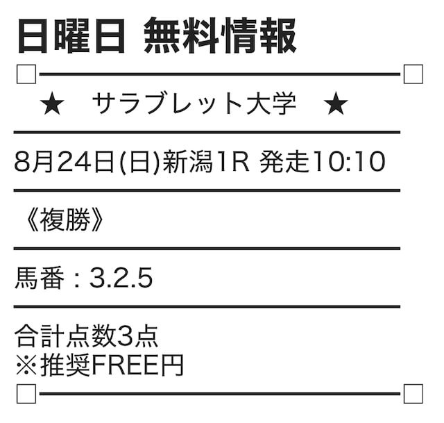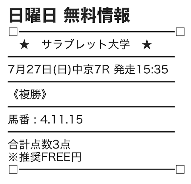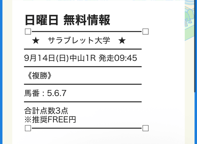 日曜無料プラン | 重賞レースに絞り見解付きで提供。 |