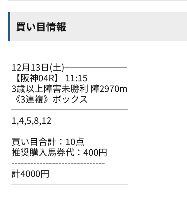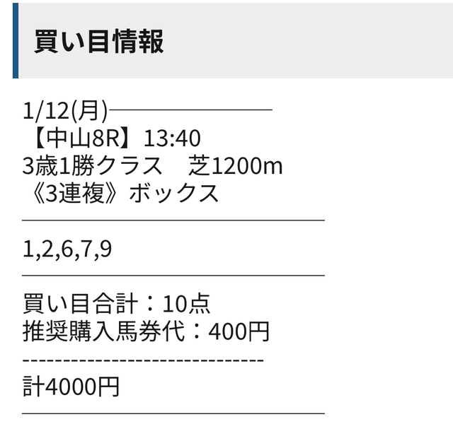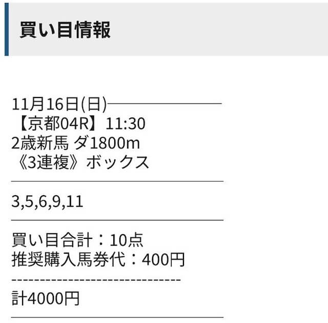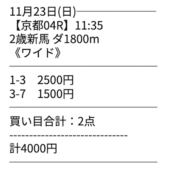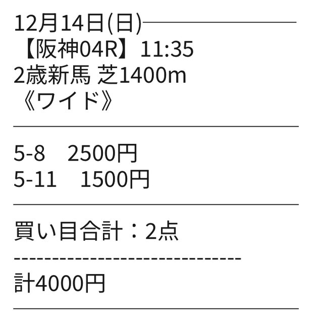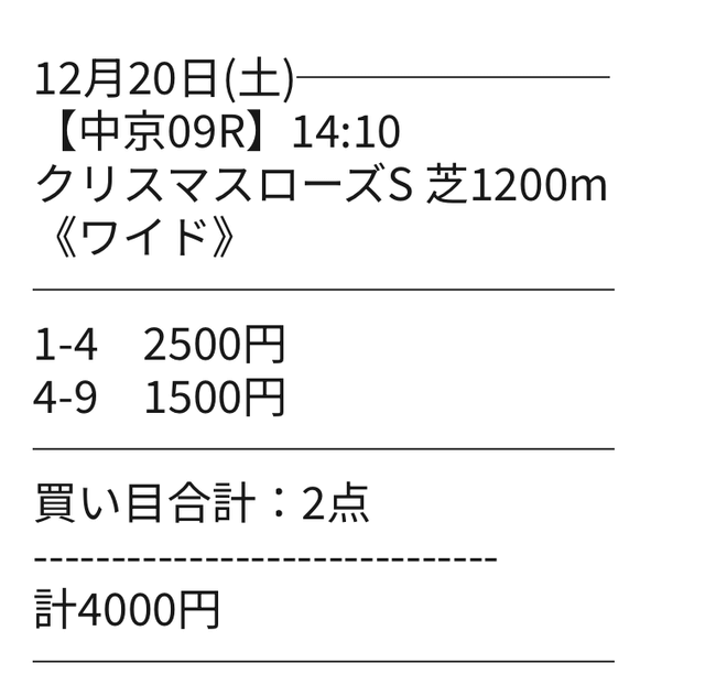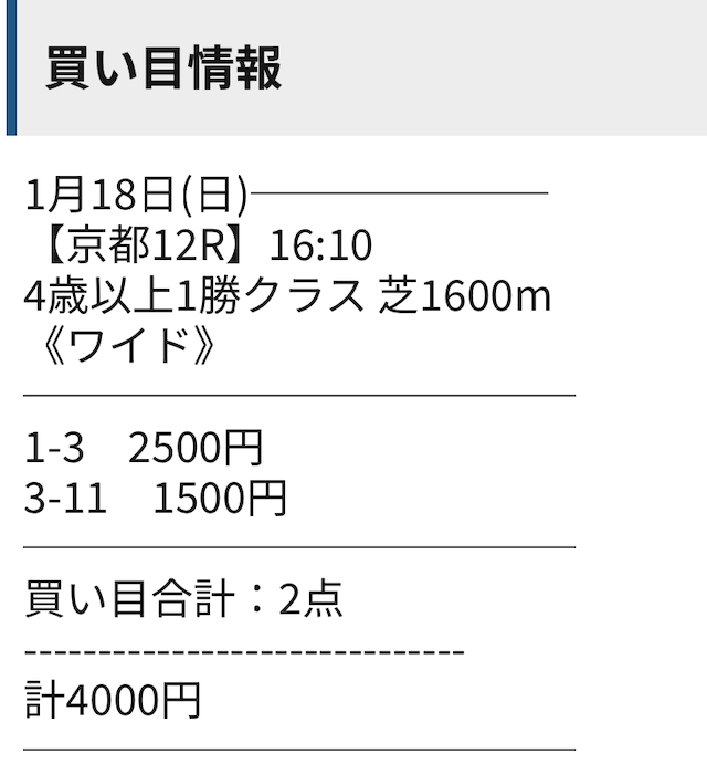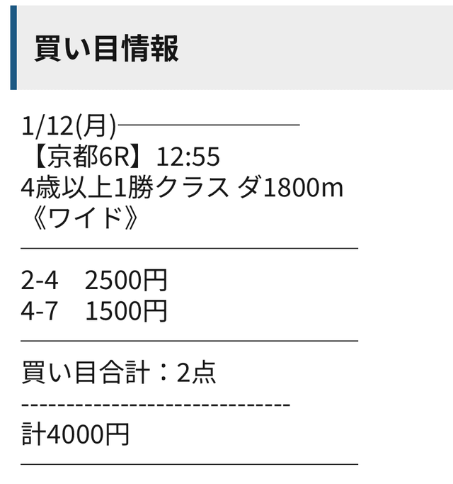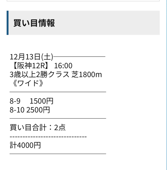 5.0名無しさん40代 男性 職業:◎良い点見逃しがちだけど口コミ見てる時に点数の少なさを言ってる人多いけどなにげに回収率すごくないか。 ワイドで点数削ったらそりゃ払い戻しには期待できないだろうと高をくくってたけど、そんなことない。 シンケイバは普通に馬券代の倍以上みたいな払い戻しをガンガン出す。 リスク取らないとかサイトの中で言ってたくせに、手堅く勝負してるだけってわけでもなさそうなの良いな。 - 2024.09.23