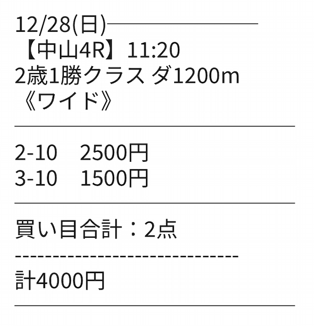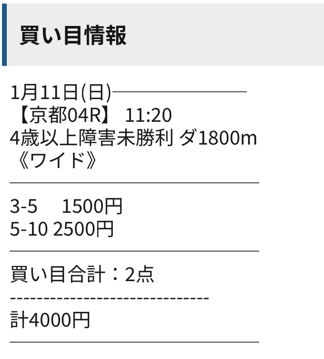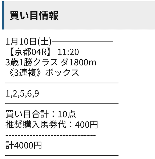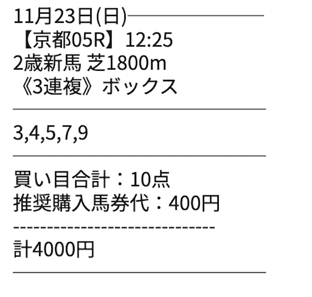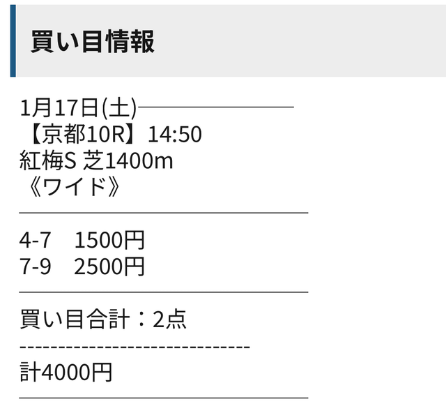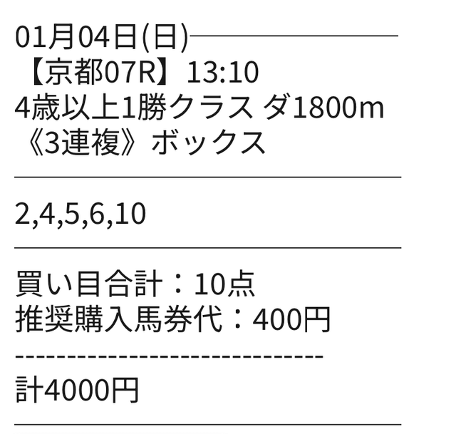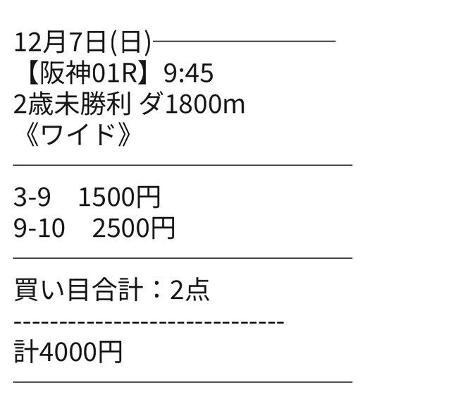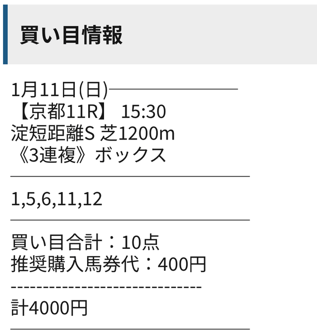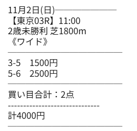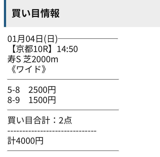 5.0名無しさん40代 男性 職業:◎良い点見逃しがちだけど口コミ見てる時に点数の少なさを言ってる人多いけどなにげに回収率すごくないか。 ワイドで点数削ったらそりゃ払い戻しには期待できないだろうと高をくくってたけど、そんなことない。 シンケイバは普通に馬券代の倍以上みたいな払い戻しをガンガン出す。 リスク取らないとかサイトの中で言ってたくせに、手堅く勝負してるだけってわけでもなさそうなの良いな。 - 2024.09.23