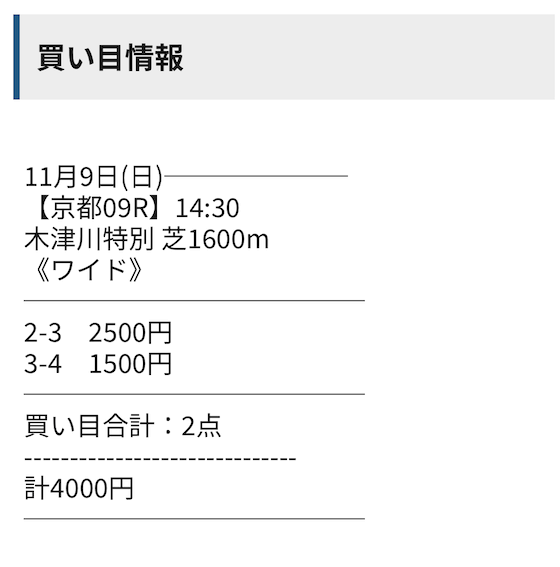 5.0名無しさん40代 男性 職業:◎良い点見逃しがちだけど口コミ見てる時に点数の少なさを言ってる人多いけどなにげに回収率すごくないか。 ワイドで点数削ったらそりゃ払い戻しには期待できないだろうと高をくくってたけど、そんなことない。 シンケイバは普通に馬券代の倍以上みたいな払い戻しをガンガン出す。 リスク取らないとかサイトの中で言ってたくせに、手堅く勝負してるだけってわけでもなさそうなの良いな。 - 2024.09.23
