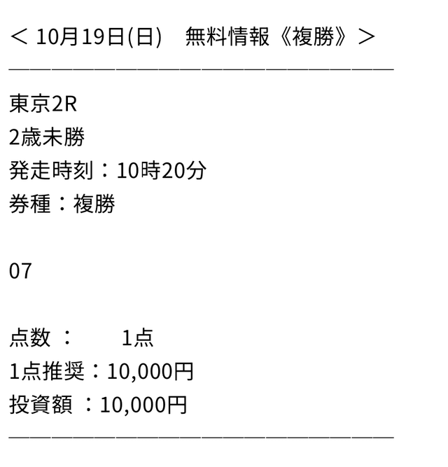 | 引渡し期間 | 競馬開催日の前日、または当日に引き渡し返品(返金)に関する特約:デジタルコンテンツという商品の性格上、原則として返金には応じられません。 |