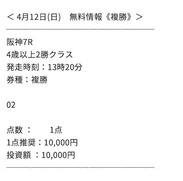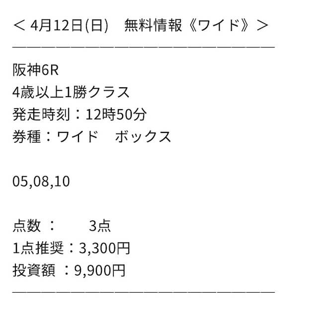 4.0匿名さん40代 男性 職業:◎良い点相馬眼は本当にすごい!馬の有利枠とかにとらわれずに人気薄の馬もちゃんと選んで、本当に勝てる買い目を提供してくれてる感じがした。しかも10万馬券とか30万馬券とか、すごく荒れるレースでも当てれるとこが感動的ですねー