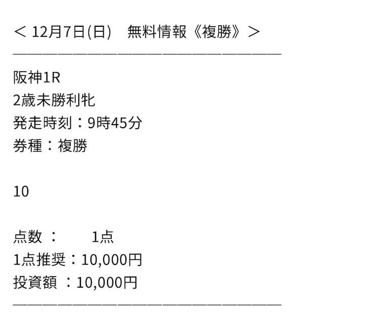 5.0ローレライさん40代 男性 職業:管理職◎良い点だいぶここのサイトにはお世話になってます。 1月くらいからかな。 ハイエンドは価格高めの設定だけど、リターンは本当爆益です。 ただ、競馬なんで外れることも考えると、毎週参加した方が回収率は確実にいいですね。
