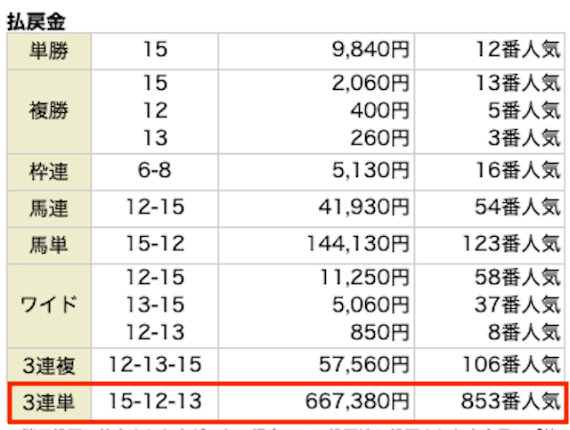 結果自体が大穴級、しかもよく見たら軸で選んでいた2番人気じゃなく12番人気が当たっている。