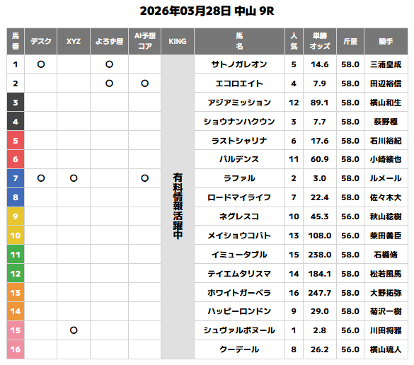 | 枠番 | 馬番 | 馬名 | オッズ | 人気 |