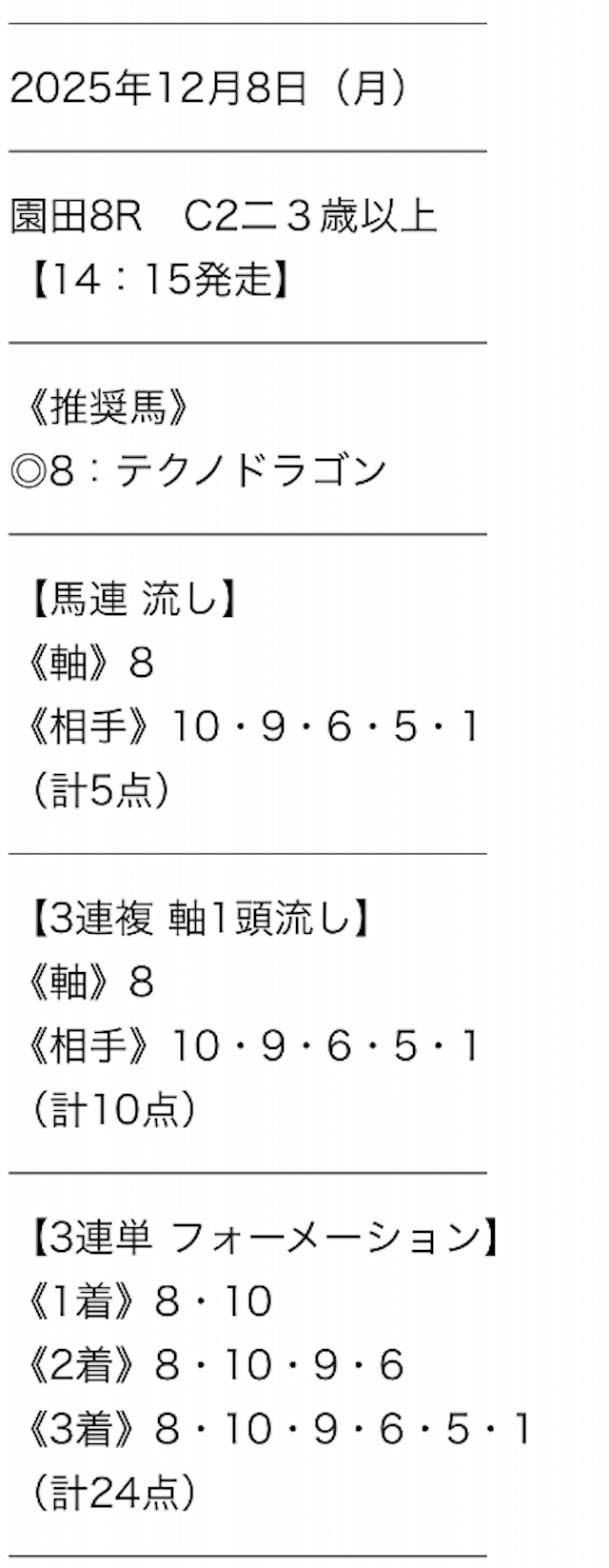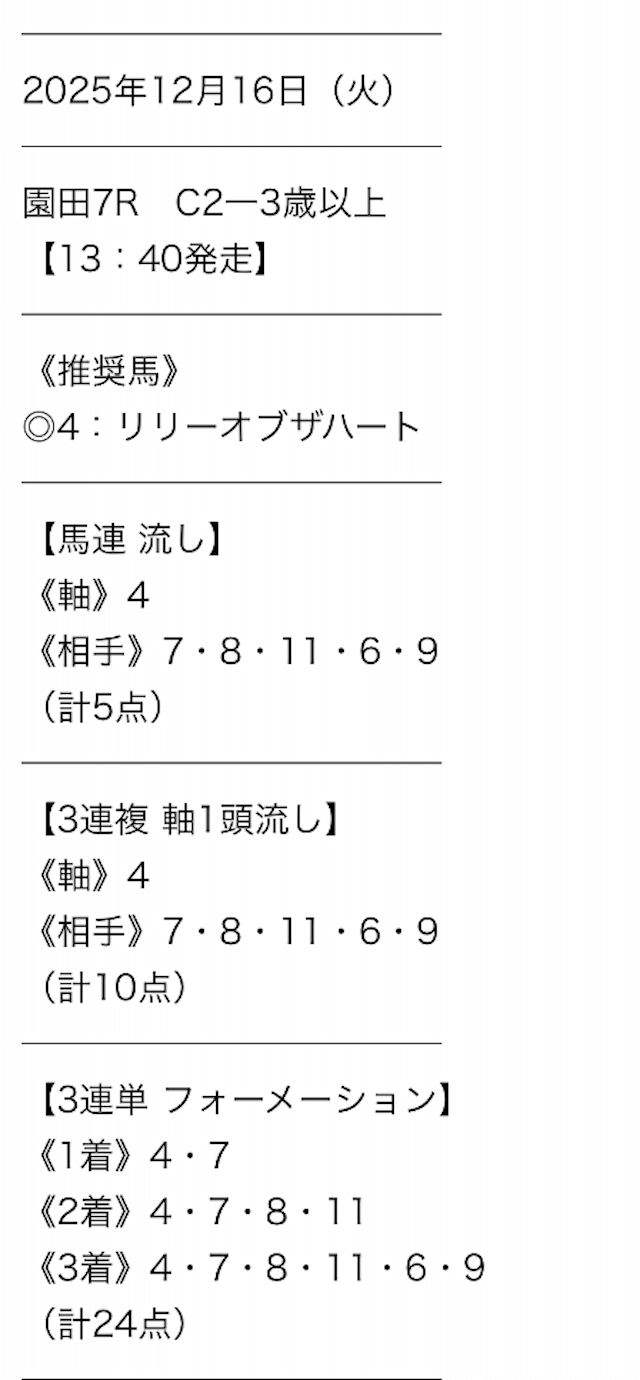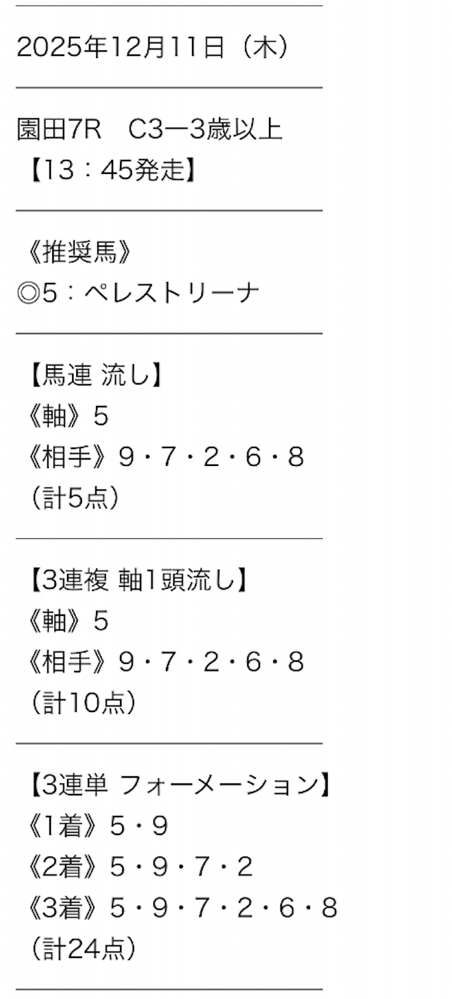 5.0名無しさん20代 男性 職業:◎良い点点数少なめ5点で勝負できるのは嬉しいな。 3連単予想だけ提供のサイトだと48点予想とか出してるサイトもあって敷居が高い。 ユーザーのことわかってサイト運営してくれてるイメージです。