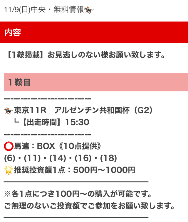 | ⭕ | 的中実績に捏造やおかしい点はないか。 | サイトに掲載の的中実績に書いてあるレースの馬券売上と控除率から払い戻しが現実的に可能かどうか確認、問題ないと判断できた。 |
