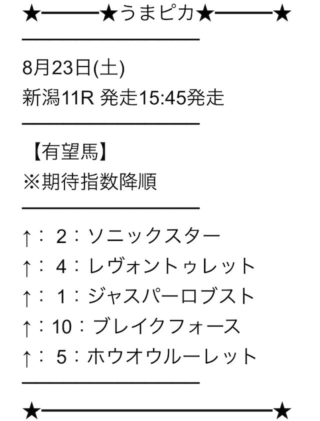 - 2025.08.272.0名無しさん20代 男性 職業:✕ 悪い点買い目で提供してほしいあくまで有力馬の情報のみ。肝心などんな券種でどう買えばいいのかは自分たちに委ねられている。自分で予想ができないから、個人的には情報の扱いが難しい。