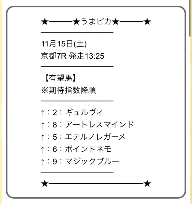 3.0匿名さん30代 男性 職業:✕ 悪い点不安な部分もある堅実な予想というよりは、穴馬も狙った攻めた予想。穴馬が絡んだときの配当は凄まじいが、人気決着になったときの配当が少ないから、今後トリガミも出るんじゃないか少し不安。