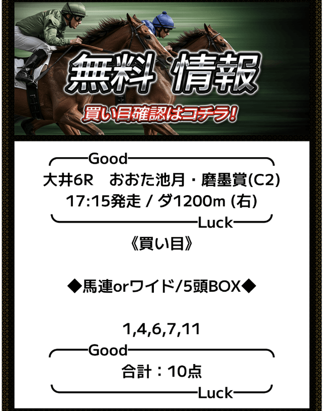 5.0ジョッキーマニアさん40代 女性 職業:◎良い点複数のプランに参加して分かったけど、バツグンは本当によく当たる。情報の質が高く、勝ちが増えたと実感してる。もうこれなしではいられないねw - 2025.07.20