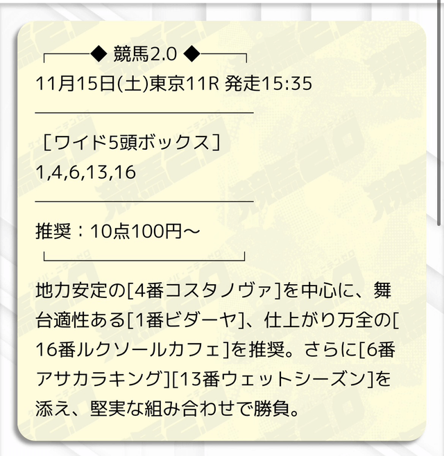 5.0名無しさん30代 男性 職業:◎良い点ワイドを活かせてる多点数で勝負していると感じる人もいるかもしれないけど、そのおかげで的中率が高まるだけなく、複数通り的中でしっかりと稼げる。 - 2025.10.5