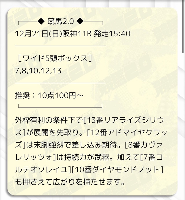 | ワイド | 10-12 | 5.6 | 8 | 的中 |